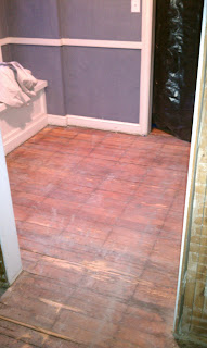 I (Kristen) have taken over the blogging for the time being. The demo continues...we are down to the subfloor now and the tile and most walls are gone. The photo above is where the shower used to be. Oh the joys of an 80-year-old home! The photo below is the mudroom between the bathroom and garage. The mudroom wall on the left will be moved approximately 3 feet back to provide space for a utility room, and the floor will be raised up so it is level with the kitchen floor.